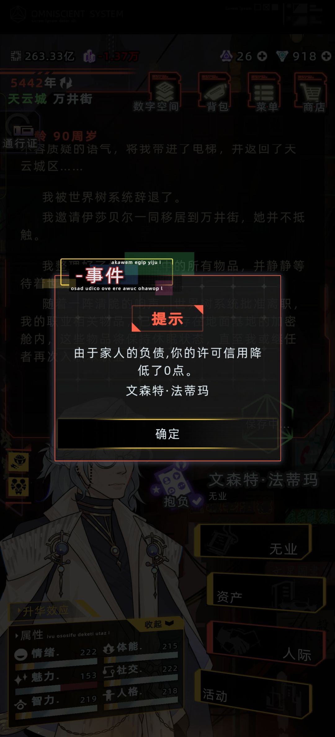 我本身大概90万存款,触发这个事件导致存款清零负债。打开账单支出显示有额外108万收入。五年后被踢出纳罗迪亚,花了60珂金回档。游戏ID:wj38366