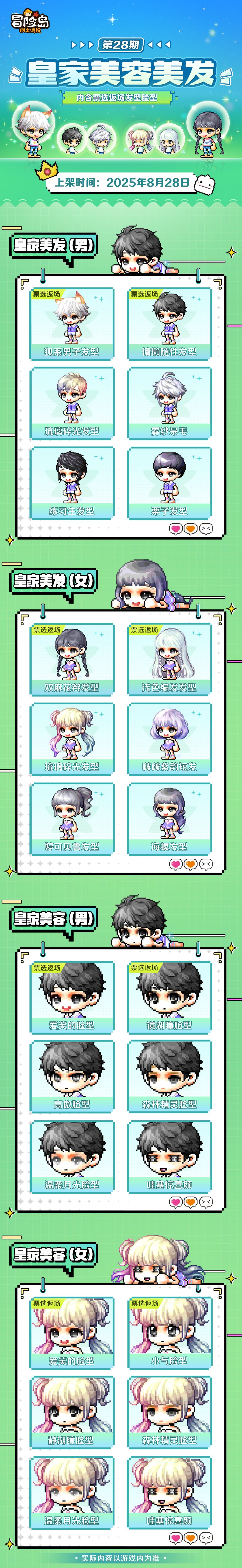 本期皇家美容美发包含【皇家美容美发返场票选活动】承诺返场的8款发型脸型,分别为