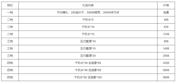 活动一:活动期间将限时上架节日礼包,礼包内容如下: