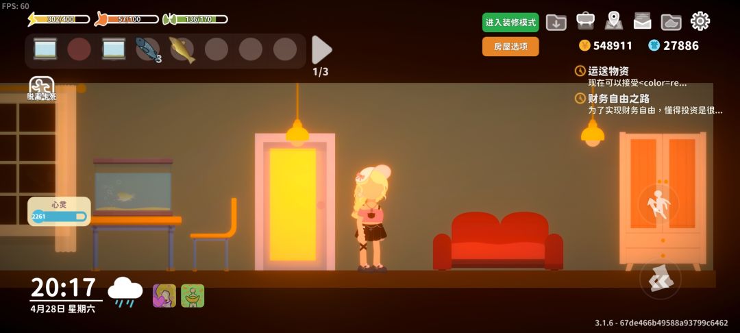 终于经过我的冥思苦想,我把公寓两个画拆下来丢到别墅里面,然后大规模使用鱼缸和沙发,梳妆台,紧接着把地下室做成工业区,石炉工作台搅拌机。还放了张床和桌子。实在是家具太少了不好放。
