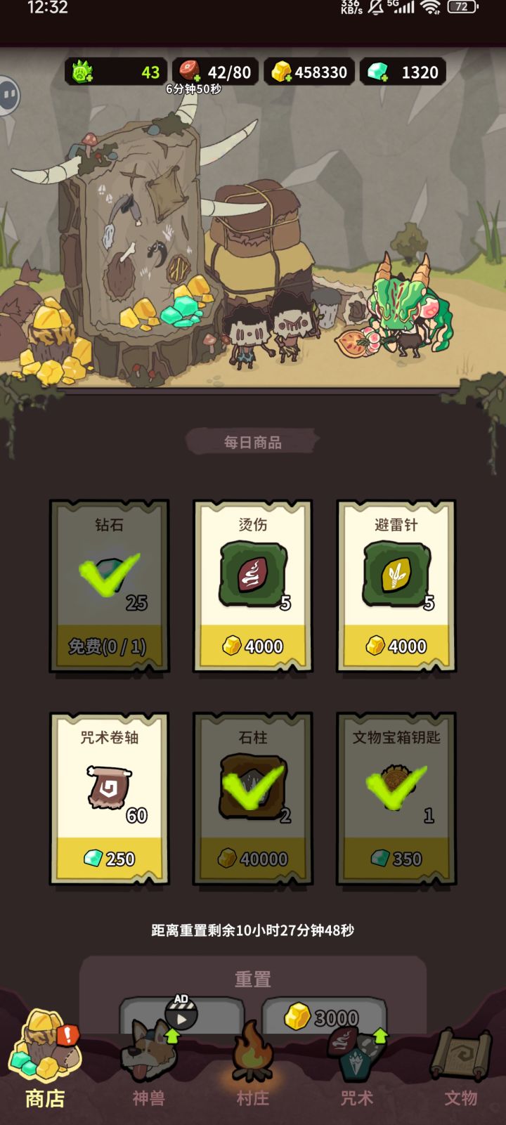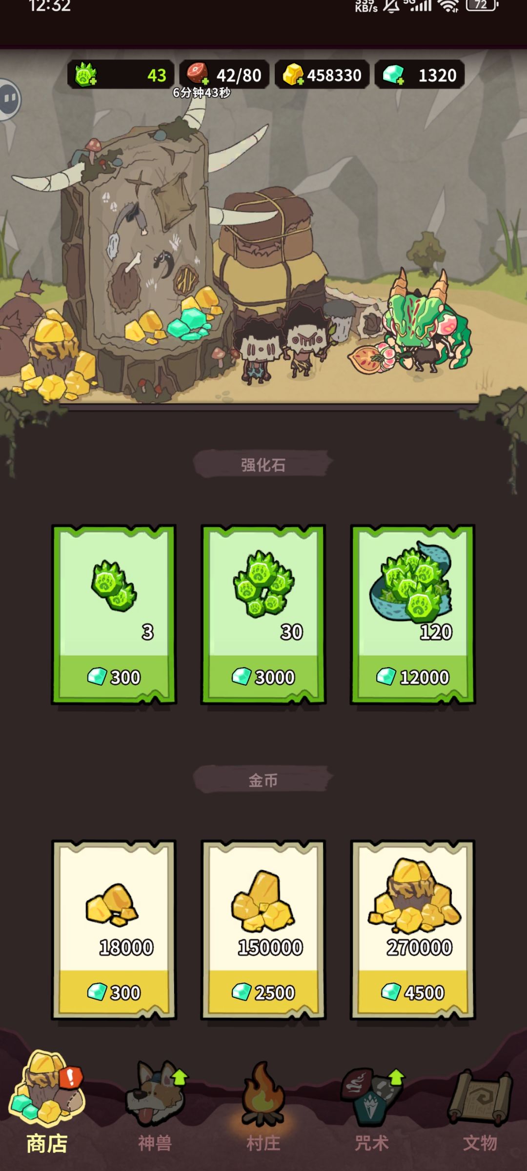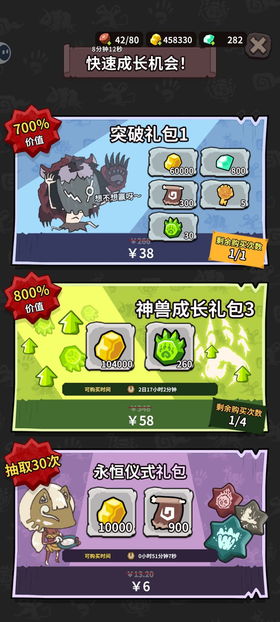 ⑤氪金优先级,各通行证月卡就不说了,按需购买。都买了还有需求的优先买神兽成长礼包,给的强化石最多。其他的性价比太低了,不是氪佬都不建议。还有一个98打包104的那个礼包不太行,不过可以买6元2文物的小礼包,性价比还可以。