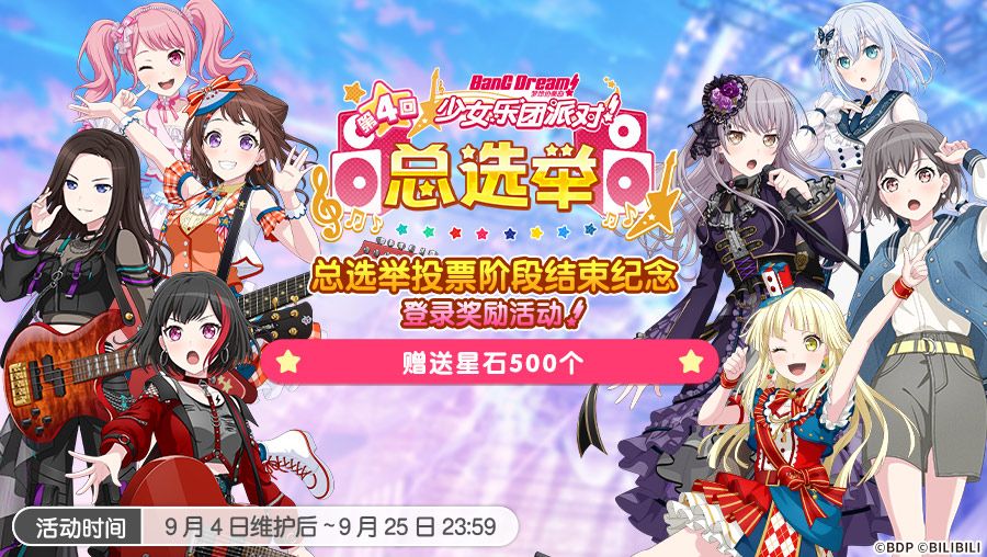 为纪念《BanG Dream! 少女乐团派对!》首届世界性总选举投票阶段顺利结束,9月4日维护后,游戏内即将开展【《BanG Dream! 少女乐团派对!》首届世界性总选举投票阶段结束纪念登录奖励】,活动期间内登录游戏即可领取登录奖励!