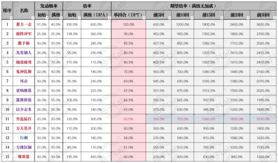DPA垫底的是【越战越勇】,仅为115%,不过考虑其高达70%的触发概率,以及最高可叠加+50武力的附带效果,所以它只是爆发性没那么好,但长期的回合收益期望并不低。