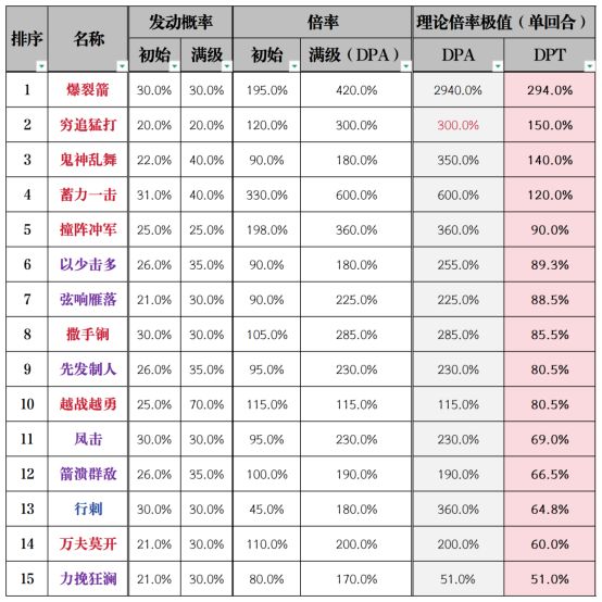 不出所料,需要2个回合准备的【蓄力一击】是DPA最高的技能,倍率为600%;排第二的是同样需要准备阶段,而且需要3个回合的【爆裂箭】,为420%;第三为【撞阵冲军】,为360%;第四为【穷追猛打】,为300%;第五为【撒手锏】,为285%。