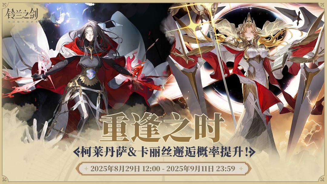 「重逢之时」限时邂逅将于 2025/08/29 12:00 - 2025/09/11 23:59 开启,传说角色「柯莱丹萨」、「卡丽丝」邂逅获取概率将大幅提升!