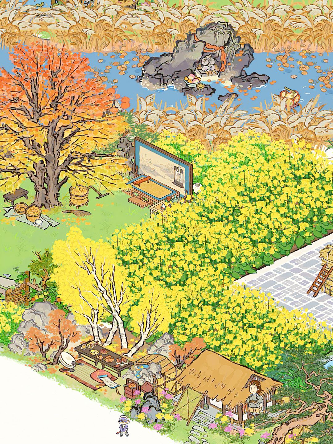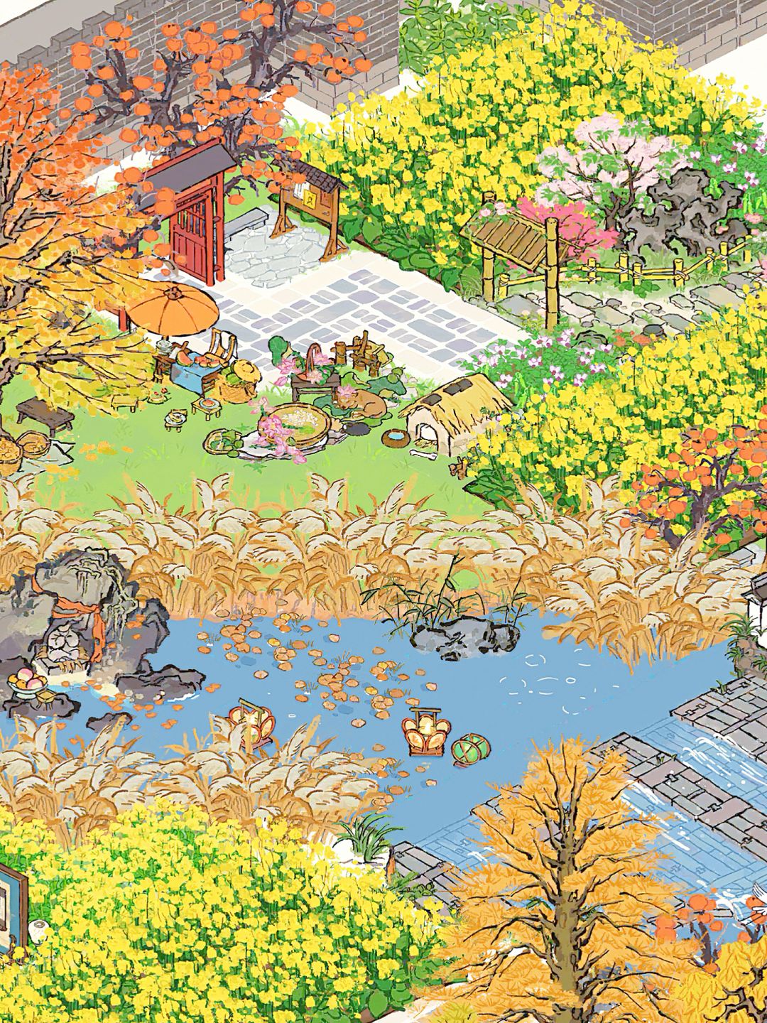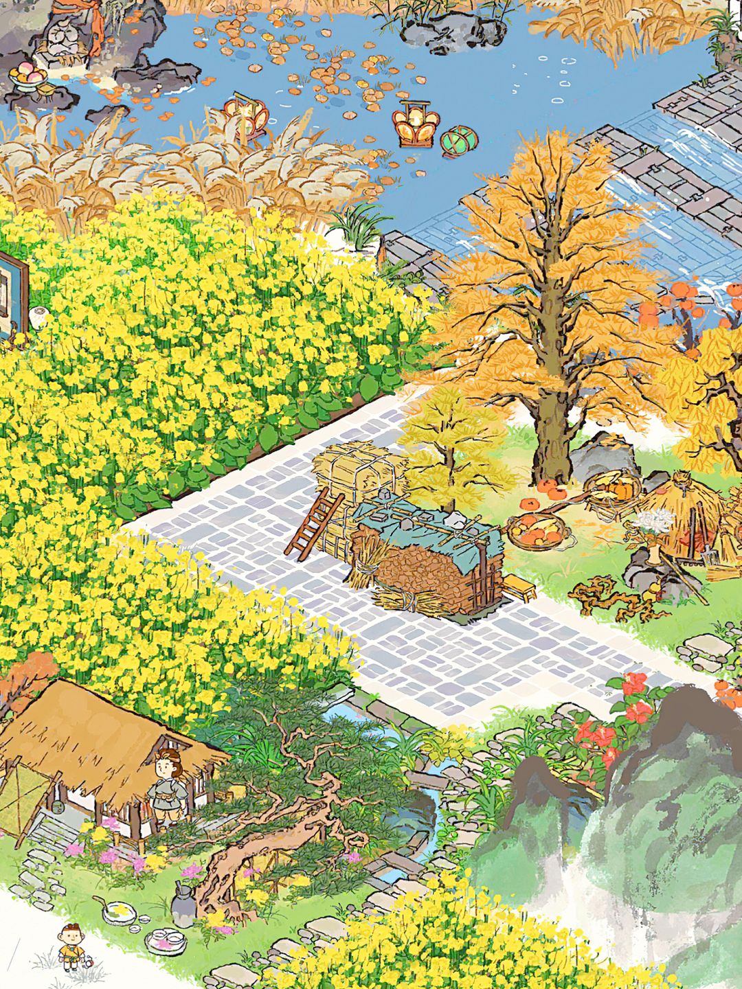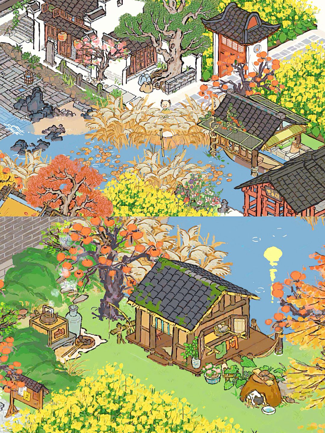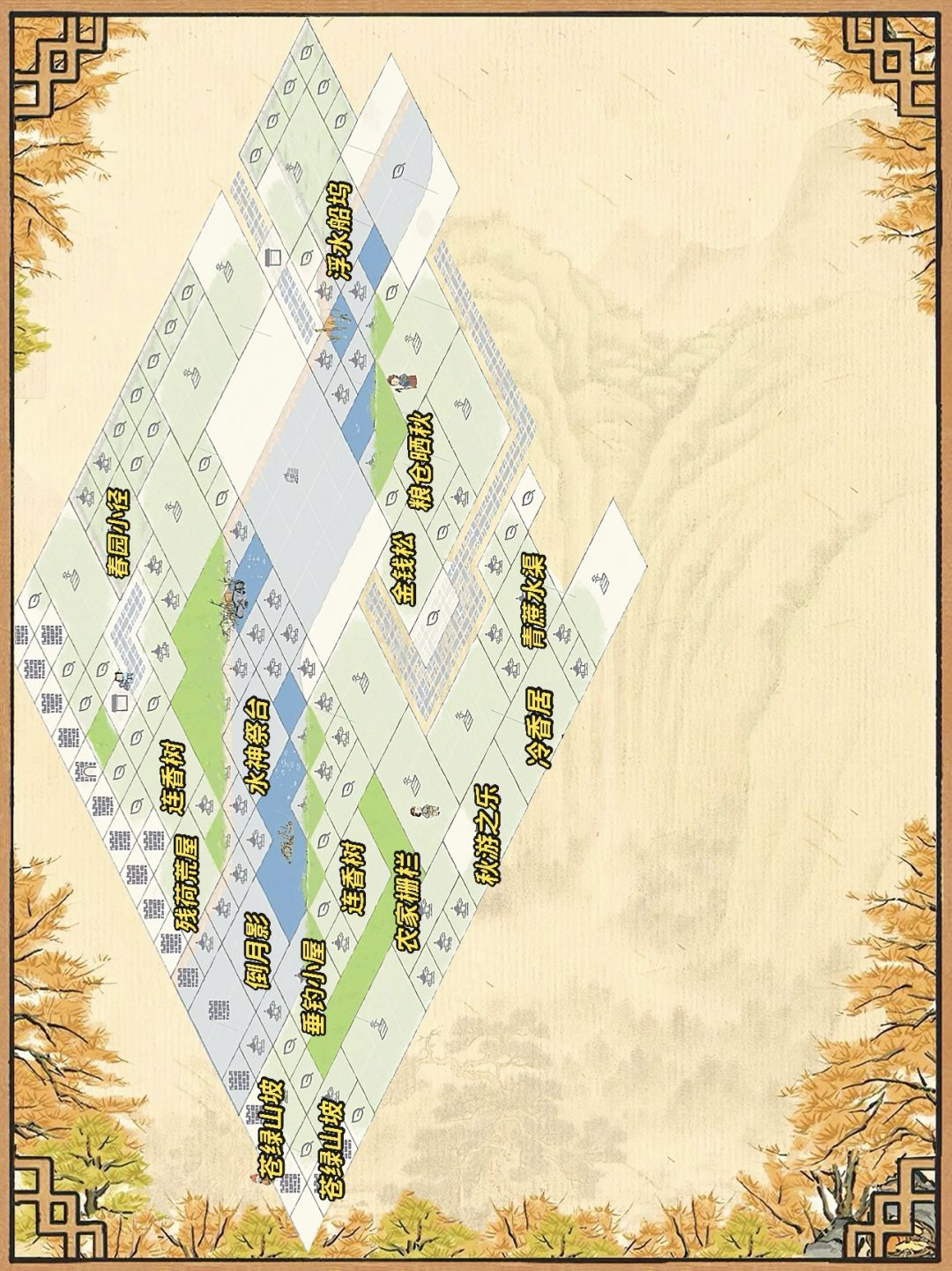 残荷荒屋、垂钓小屋、连香树、金钱松、春园小径、农家栅栏、粮仓晒秋、浮水船坞、花篱犬舍、岁丰狸闲、瓮下乘荫、荷落犬眠、清梦沉酣、芦苇丛、水中落叶、水神祭台