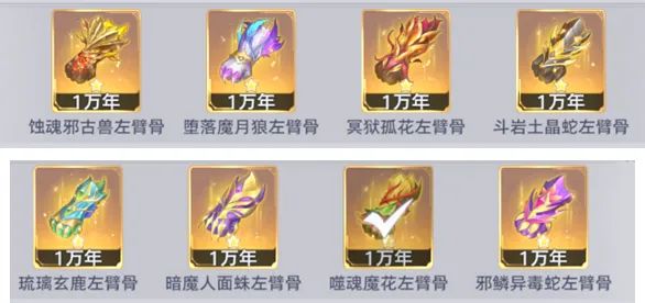 然后是右臂可选的8个魂骨,其名字就和左臂有一定区别了,它们的效果汇总如下: