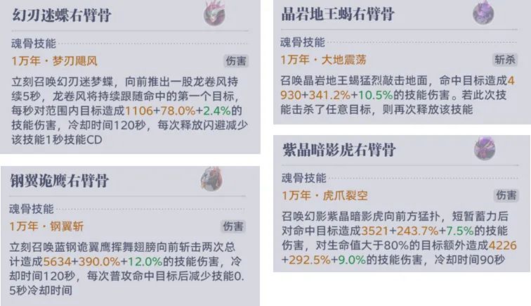 - 银翼龙:造成固定次数的持续伤害后有额外伤害+敌人“灼烧”或“中毒”状态时的额外魂骨技能增伤