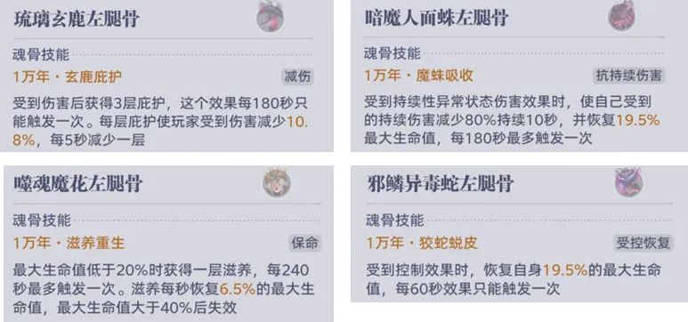 针对左腿的8个魂骨,几乎全部都是减伤或回血类的效果,不过从功能性上分析,维一个人还是倾向于选择噬魂花或者邪麟蛇(敌人控制技能较多时可考虑),当然如果是火队选择“冥狱花”也是一个不错的选择,但满足低于50%血量即立刻消耗所有火种的设定,在部分场合可能达不到最佳的回血效果。