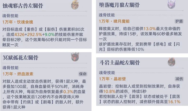 - 银翼龙:伤害+敌人“中毒”或“灼烧”状态时的下次魂骨技能增伤