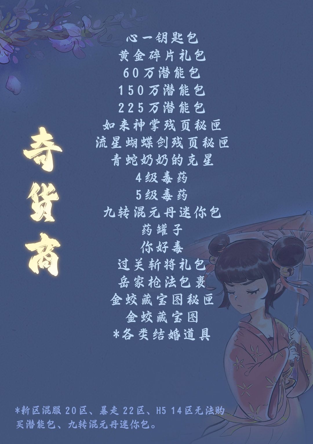 奇货商处引进了不少好东西,有需要的少侠可前往购买。新区混服20区、暴走22区、H5 14区无法购买潜能包、九转混元丹迷你包。