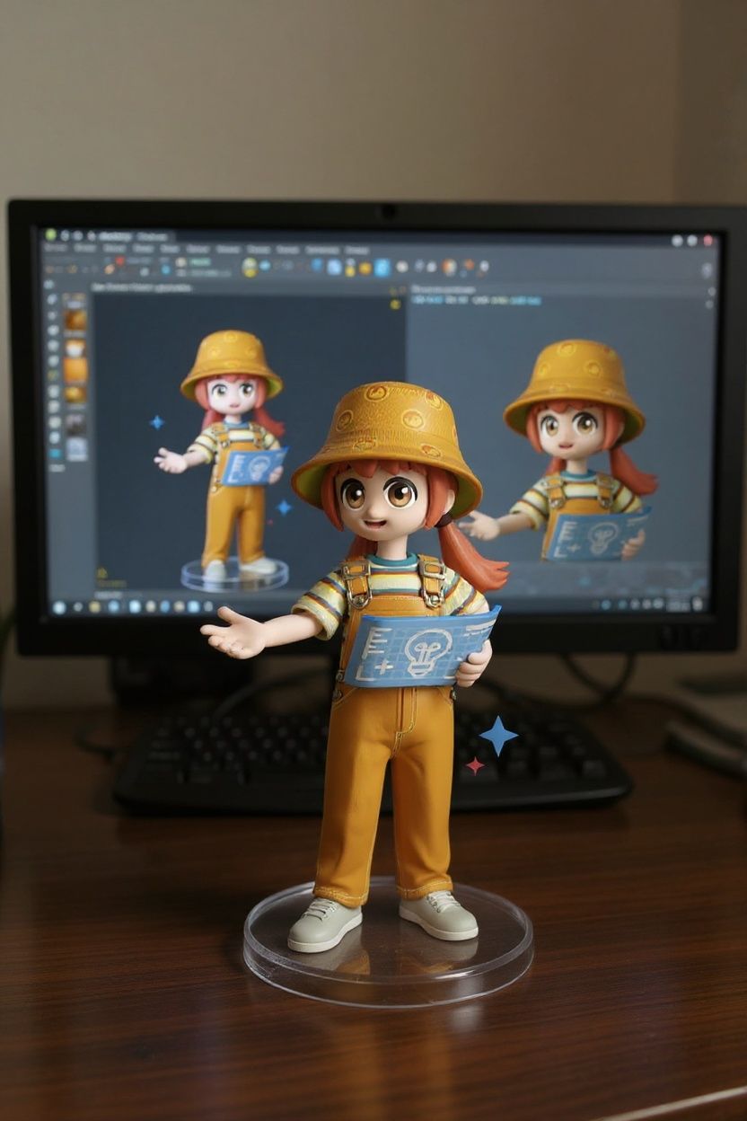 第四步:在对话框中输入Use the nano-banana model to create a 1/7 scale commercialized figure of thecharacter in the illustration, in a realistic styie and environment.Place the figure on a computer desk, using a circular transparent acrylic base