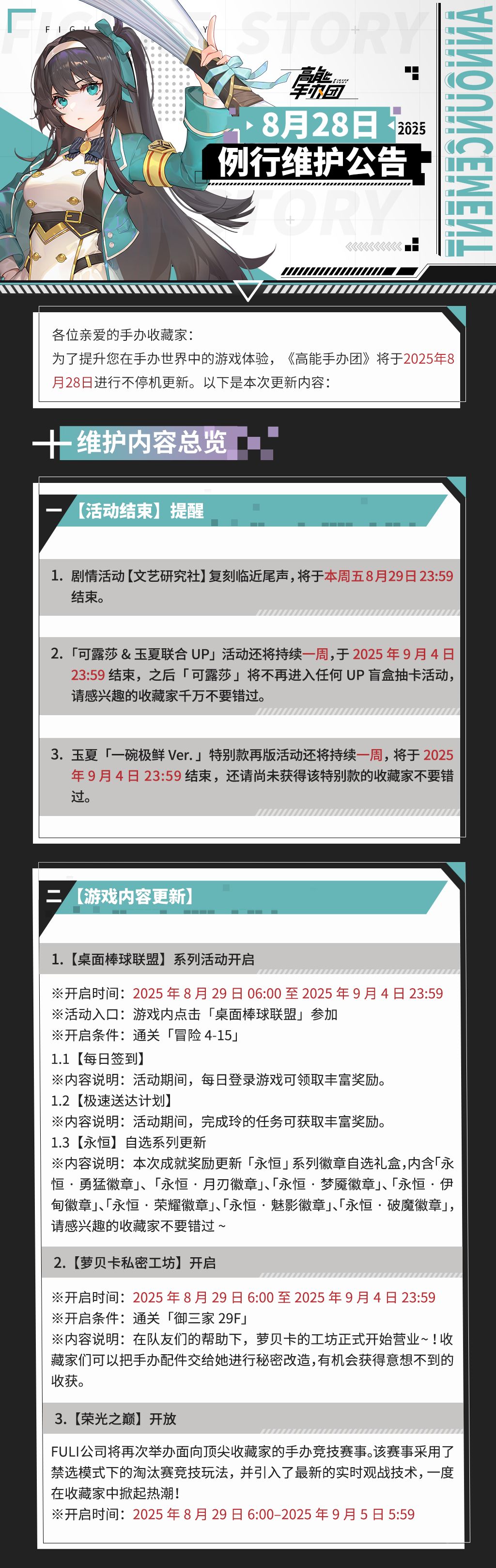 各位亲爱的手办收藏家:为了提升您在手办世界中的游戏体验,《高能手办团》将于2025年8月28日进行例行维护。详细公告内容请点击下方图片查看: