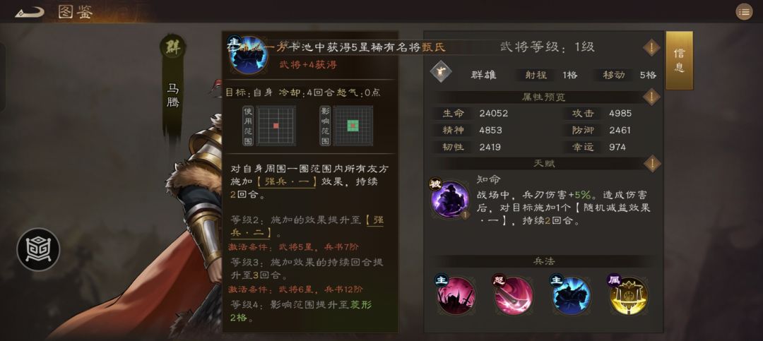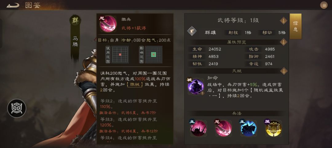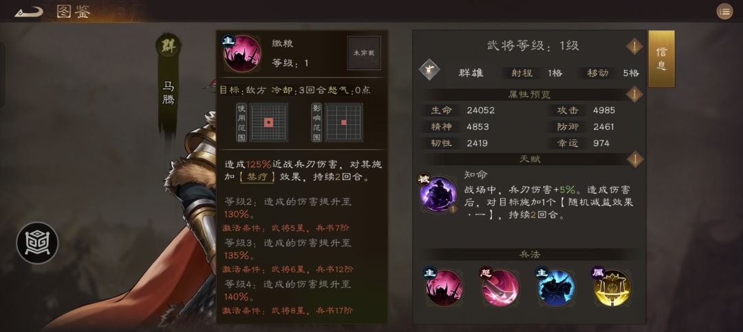作为最后出场的三星君主将,马腾凭借一身绝活没有让我们失望!被动攻击给减益,主动三技能都是宝。禁疗是很多副本必备的技能,专打回血专业户。强兵为我方带来30%的增伤,在很多敌人等级高压制强的关卡非常有用!大招都有两回合缴械。。。真是完美!