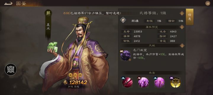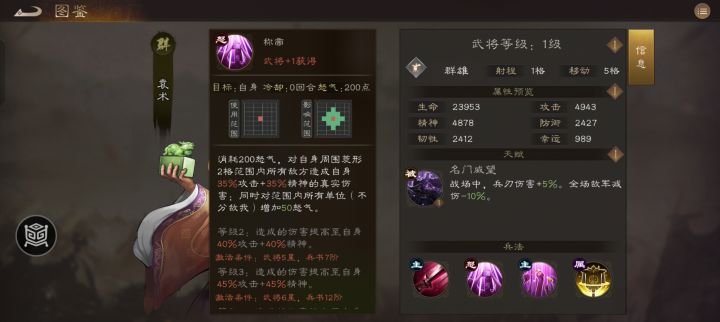 我们大名鼎鼎的冢中枯骨四世三公的大袁术,居然浑身都是宝!首先被动全场敌军减伤-10%,这个被动是目前游戏里的独一份啊,我王威武!主动技能嘲讽,一个有用的控制技能,而且无视闪避!主动buff机能在增益我军同时还能给自己额外攒50怒方便立刻放大招!怒气技能更是给周围我军群体加50怒气,这个战略意义就大了去了有没有?!