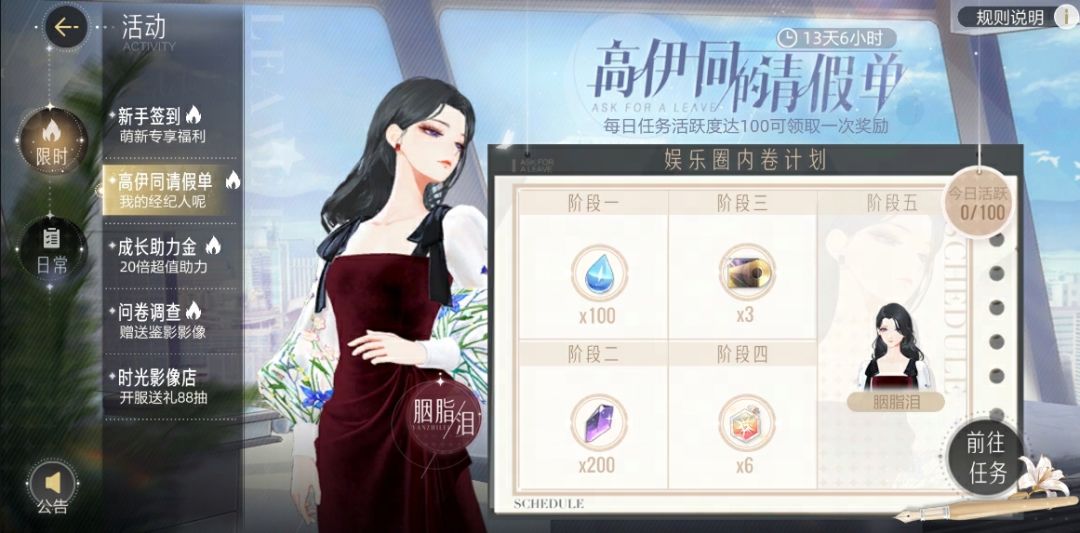 “高伊同请假单” 活动复刻,在8月29日0:00-9月10日23:59活动时间内,任意5天日活达到100,即可免费获得【胭脂泪】及配套发型哦~