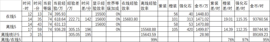 3、第一次测试离线经验效率为在线的91%,很有可能是相同的,这说明离线并非没有世界等级加成(二、三次为82%、83%,但是不如第一次精准,后面有说明);