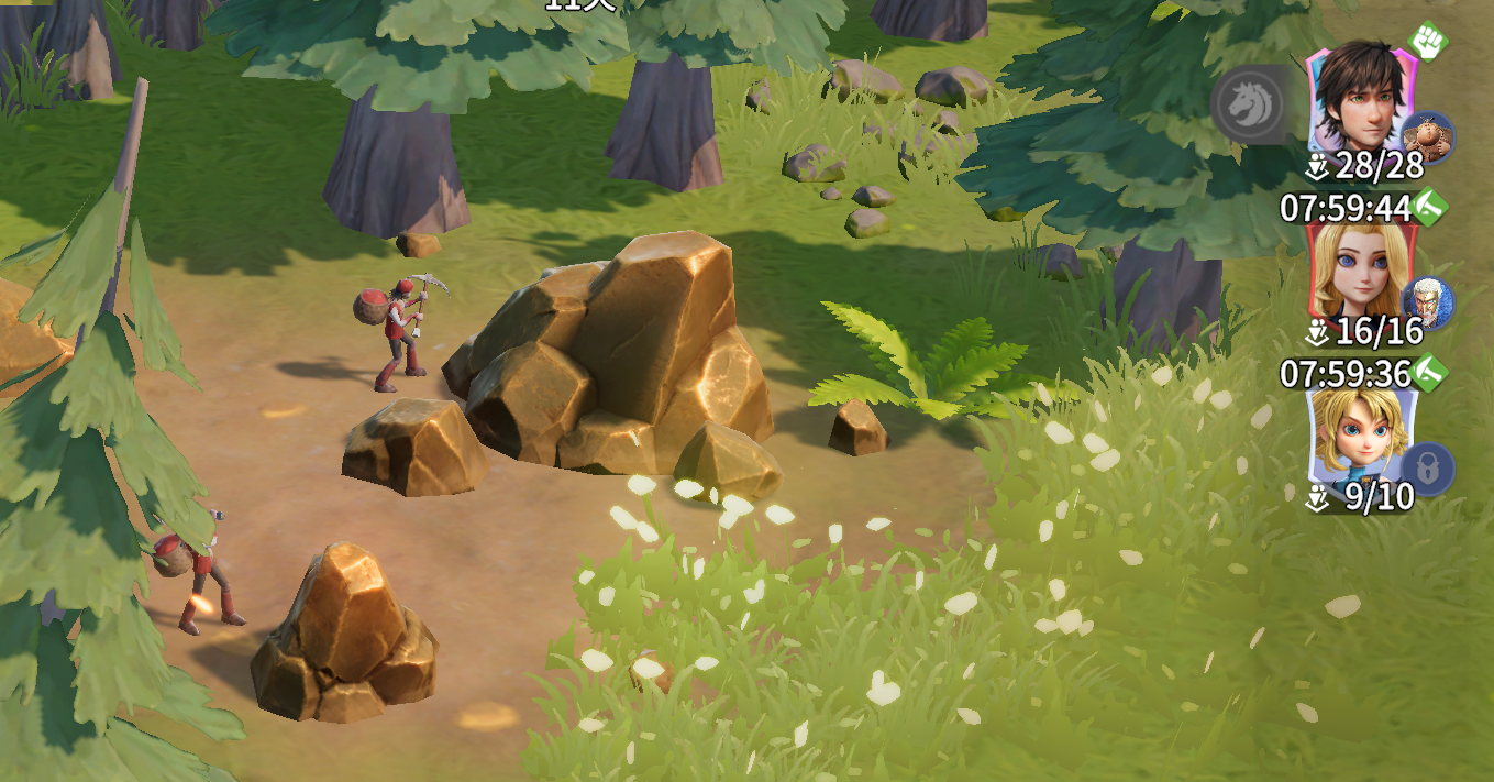 第一天推进到建筑时间用完、英雄战力打不动烽火和远征之后,基本可以先下线等待建筑升级了,下线之前,记得安排几个队伍去挖矿,慧晶或铜矿,为明天的开荒做准备。反正下线闲着也是闲的,挂机也能有资源。
