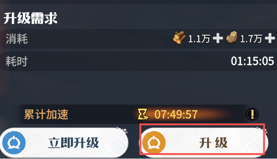 这里阿正再给大家分享一个省时间小技巧:每次升级建筑时,都可以先点右边的“升级”,让联盟的盟友帮助你,帮助进度满了之后再点“立即升级”,这样每次可以剩下五六分钟的时间,日积月累,你要比别人省出更多建造时间。