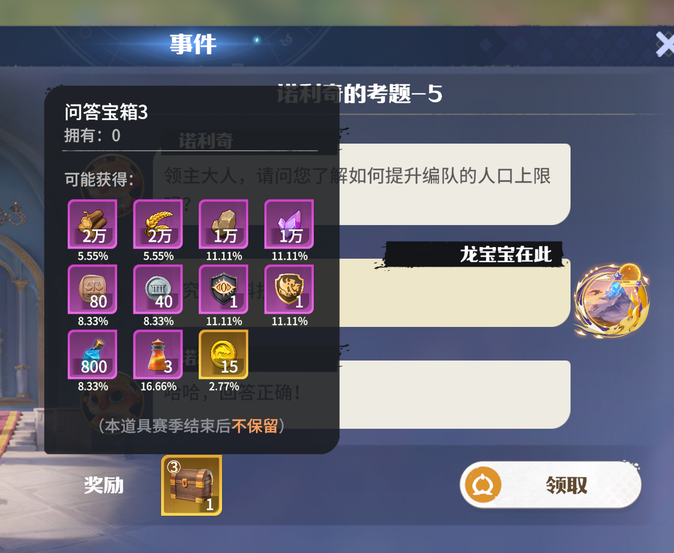 除此之外,回答主城幻龙宝宝的问题,也能获得额外的资源。