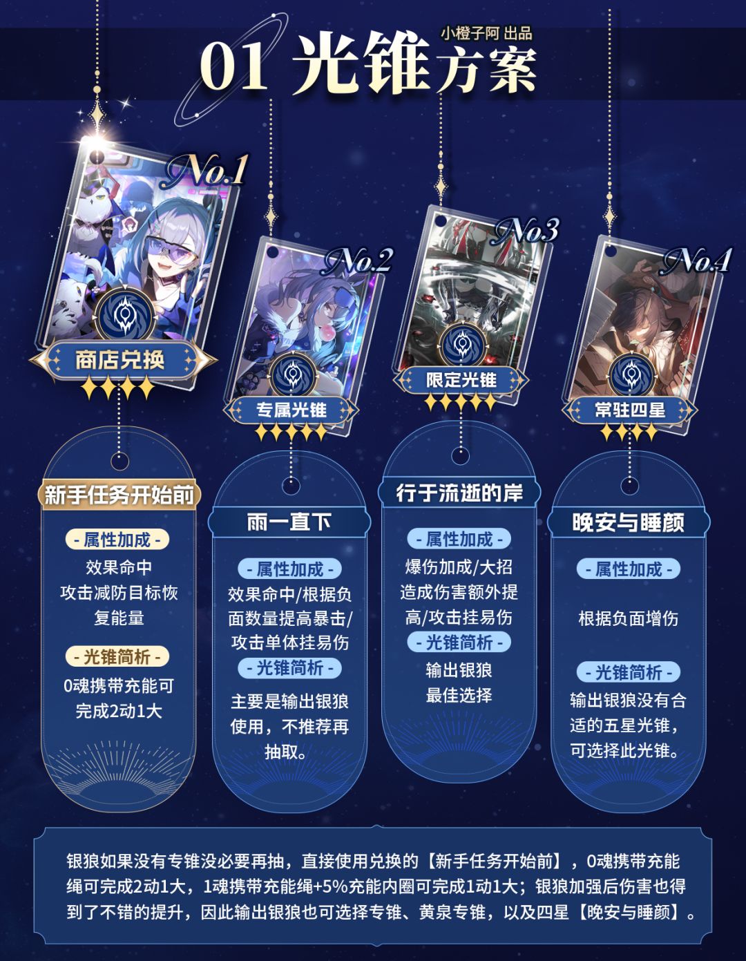 0+0银狼就有着不错的辅助能力,极限能做到2动1大;2金优先抽取1魂,稳定2动1大,极限可做到1动1大;其次推荐抽取2魂,提高队伍整体输出上限。专锥没加强,不推荐抽取,直接使用兑换的【新手任务开始前】光锥。