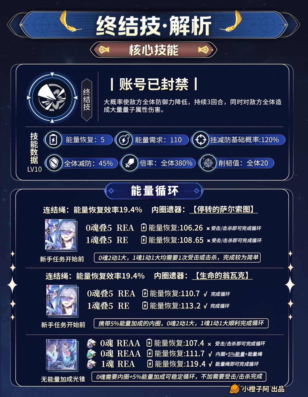 改版后:终结技由单攻调整为群攻,使敌方全体防御力降低。