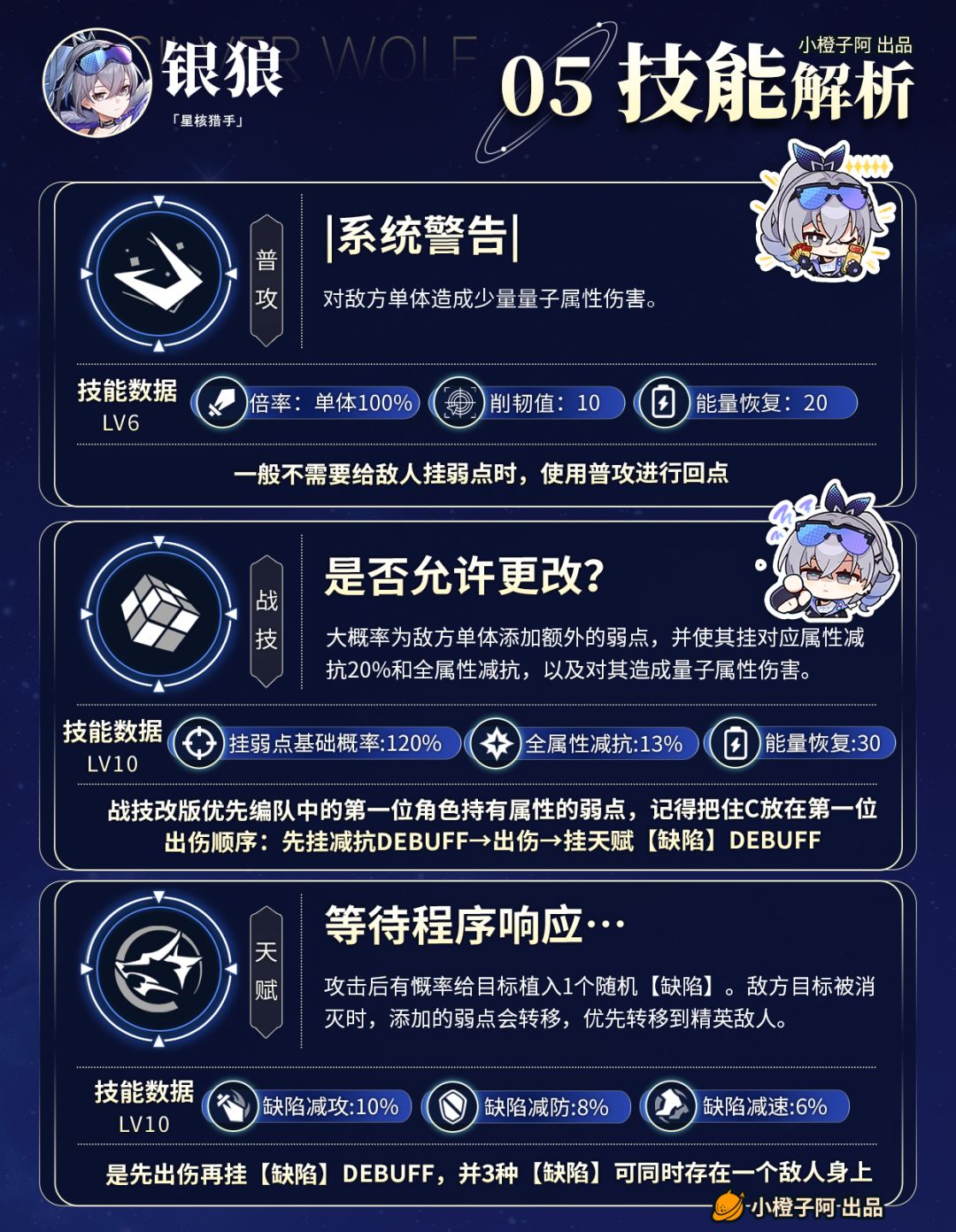 改版后:减防能力提升,攻击挂【缺陷】的基础概率提高,并且敌方目标被消灭时,银狼对其添加的弱点会转移给场上存活的未被银狼添加弱点的敌人,优先转移给精英级别及以上的目标。
