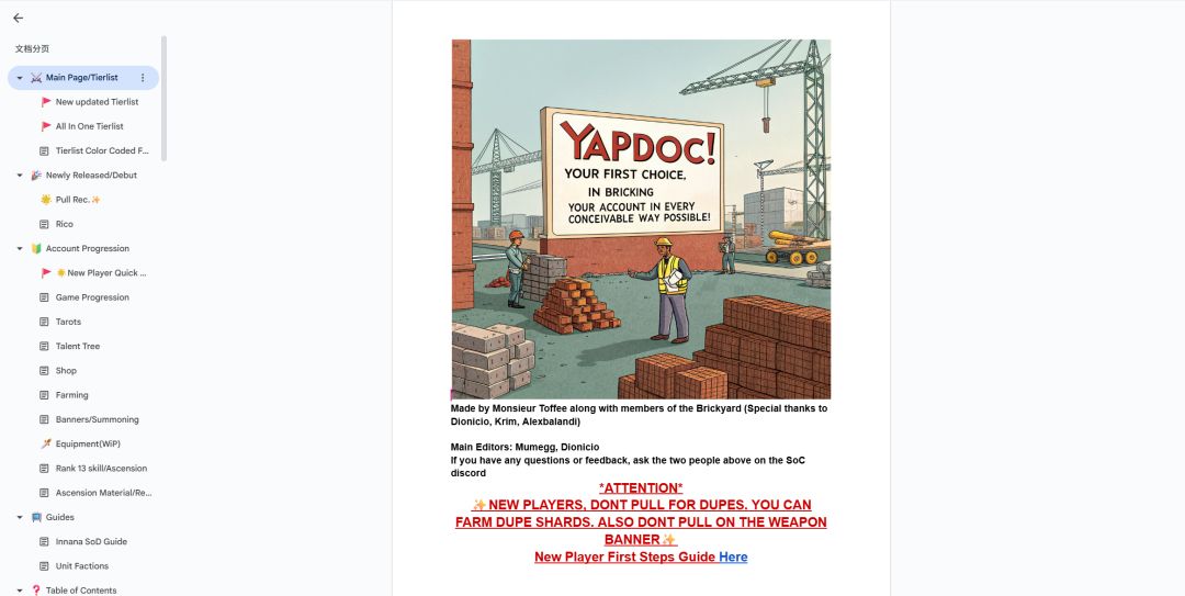 由 Monsieur Toffee 与 Brickyard 成员共同制作,Mumegg 和 Dionicio 担任主要编辑。内容涵盖角色介绍、梯度榜、使用攻略以及详细新手指南,适用于国际服与台服。该文档持续更新中,查看需科学。