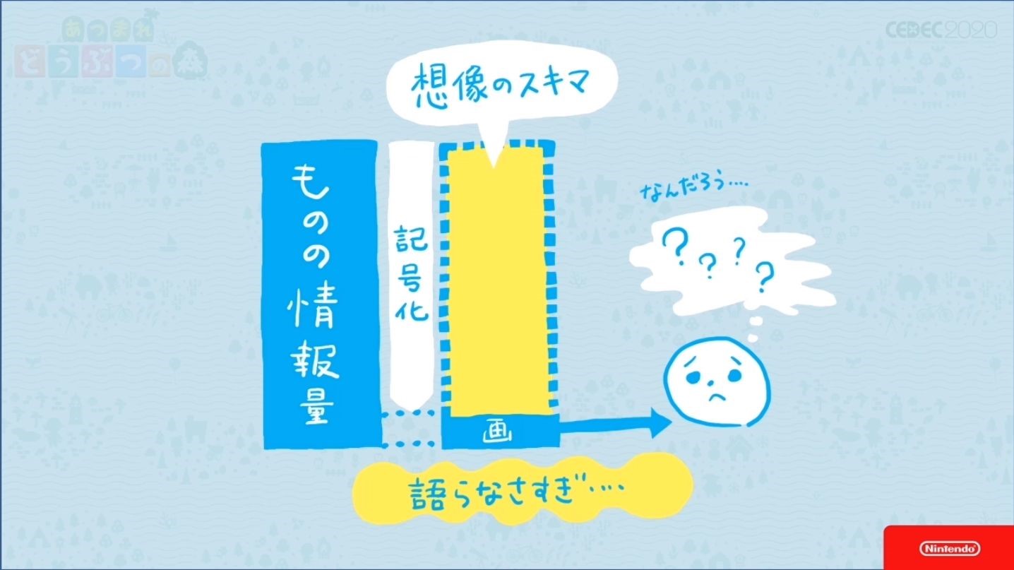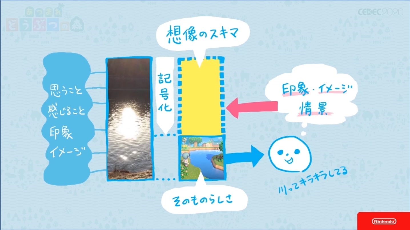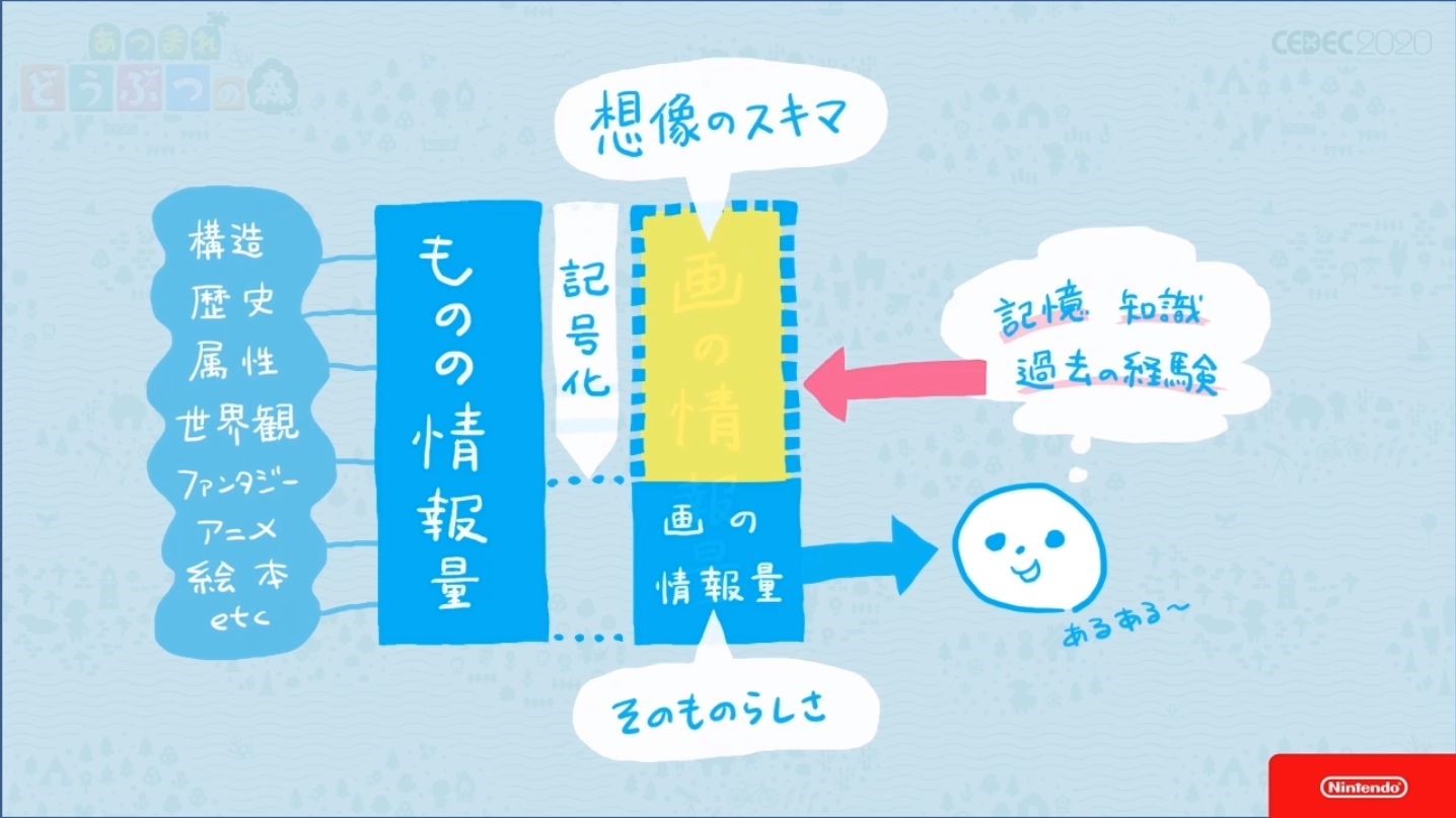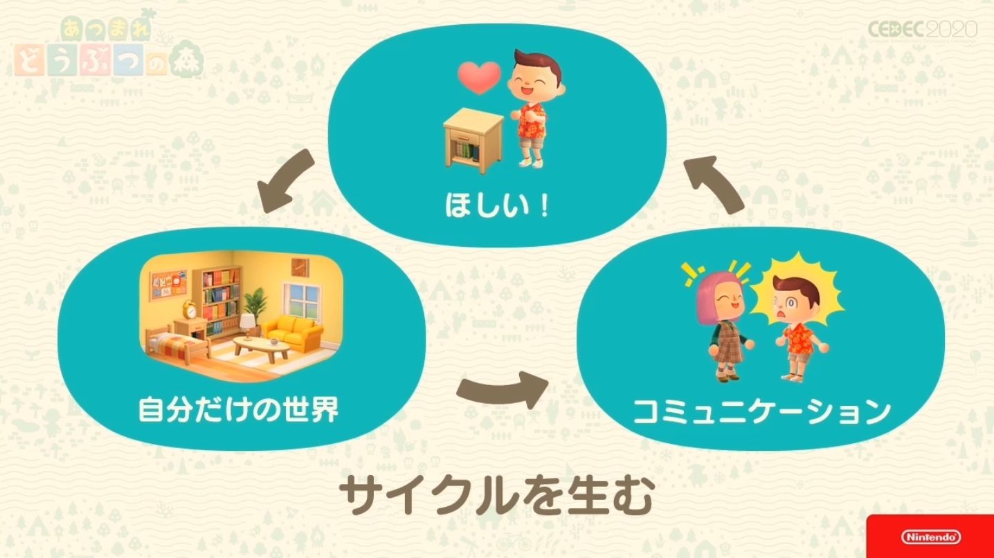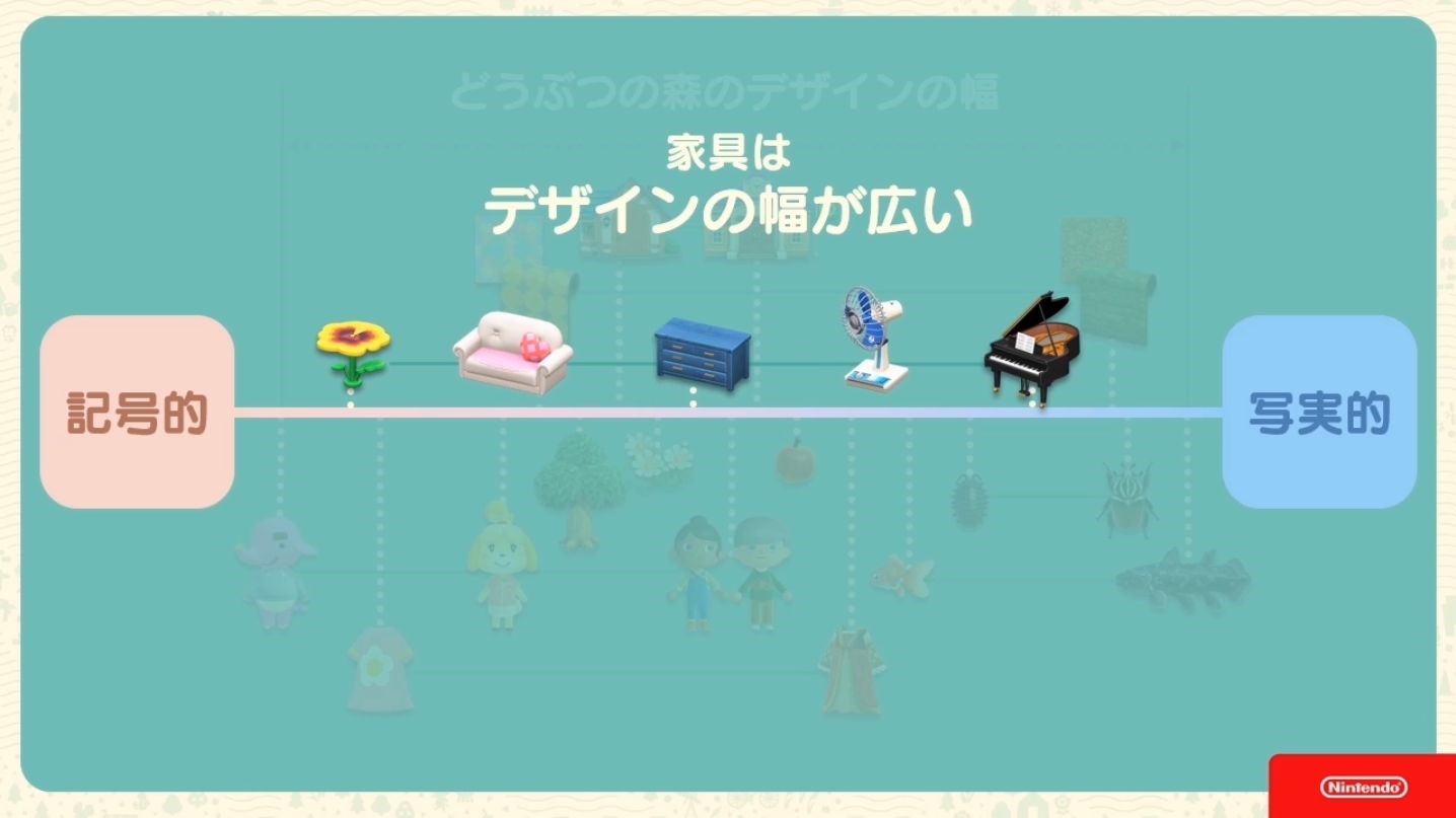 接下来,由家具设计师组长杉本裕美女士来介绍本作中家具是如何设计出来的。玩家们通过创造自己的世界,与其他玩家进行交流分享,然后更加享受在动物之森中的体验,由此形成循环。为了达成这种良性循环,需要设计出令人觉得“想要的”家具。这就是本作家具设计的初衷。