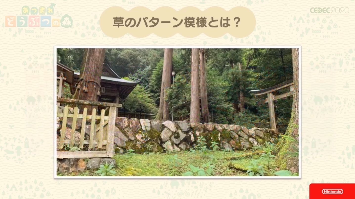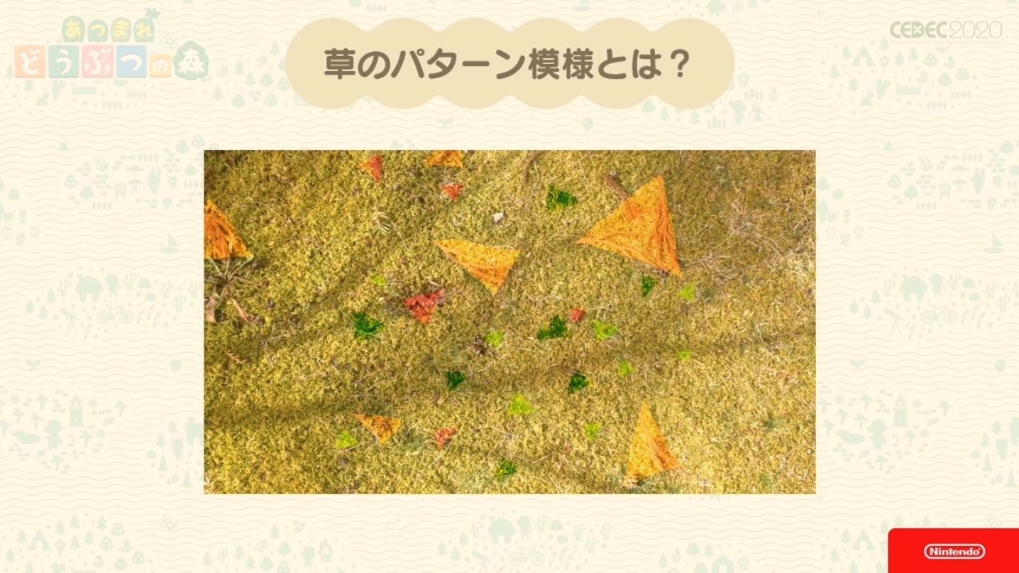 以下照片是高桥先生经常去的一家神社。仔细观察此处草地的照片,会发现虽然整体是绿色的,但是其中混杂了大量植物和落叶。对此进行几何化和色块化,比较接近于由三角形排列的图案。动物之森中的森林和草地,正是像这样对植被和落叶等构成草地的要素进行符号化所表现的。通过改变整体颜色,也能对一年四季的变化进行符号化。