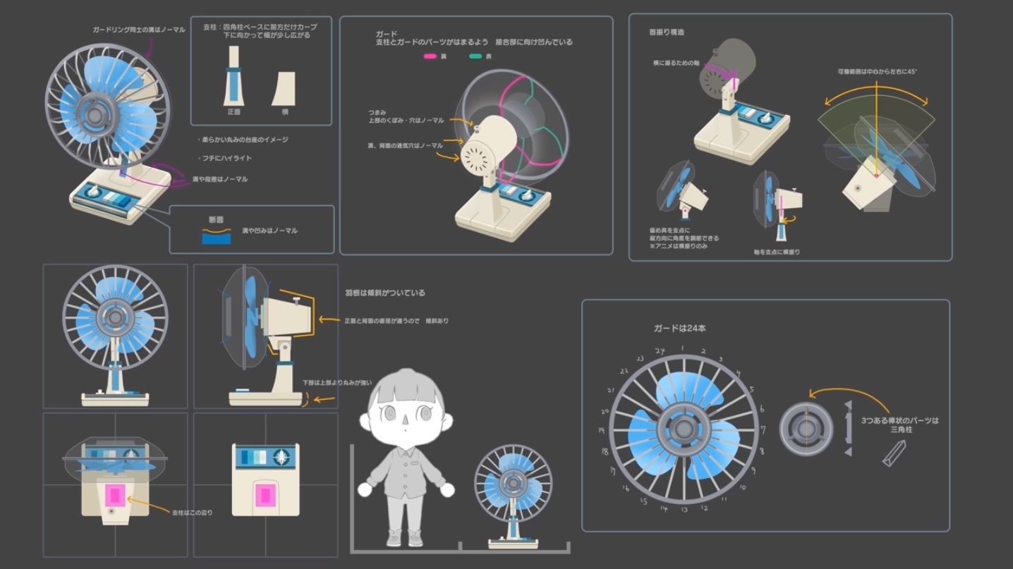 看上去对区区一台电风扇就准备了这么多的设计图,还进行了这么多的细节调整,但实际上在本作中,所有的家具都是通过这样的过程设计出来的。这么做的原因是家具类是本作中设计幅度最广的种类。从偏写实化的到偏符号化的,各式各样的家具需要在同一画面下进行展示,那么这种程度的细节调整就是必不可少的。