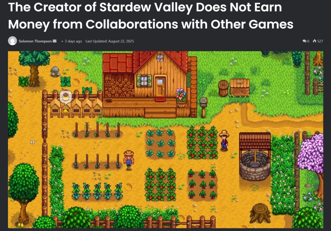 他不愿通过联动盈利,因为《星露谷物语》的游戏销售收入已经足够支撑开发;