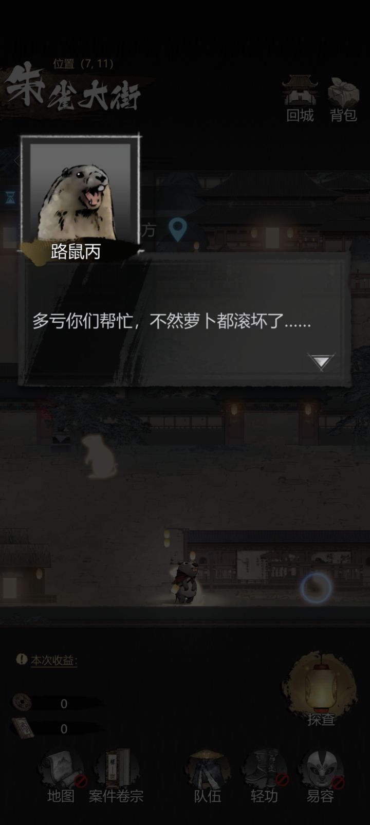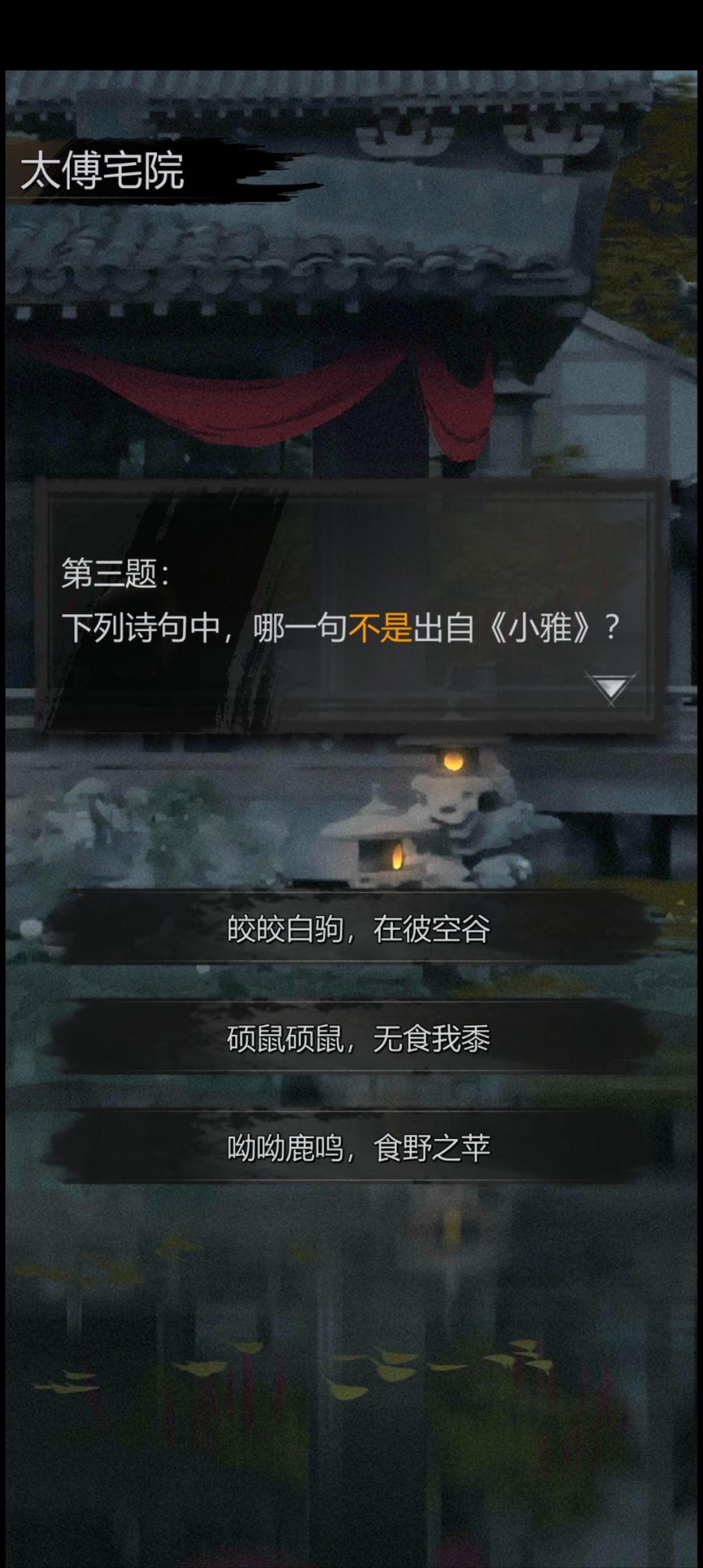 看我截图,丙鼠那里大萝卜=300银两,小萝卜1银两。旁边屋子兑换大萝卜等。然后太傅答题答案截图了:1、白驹2、第三个3、硕鼠硕鼠,我站的位置就是成就《甲鼠》无的地方。
