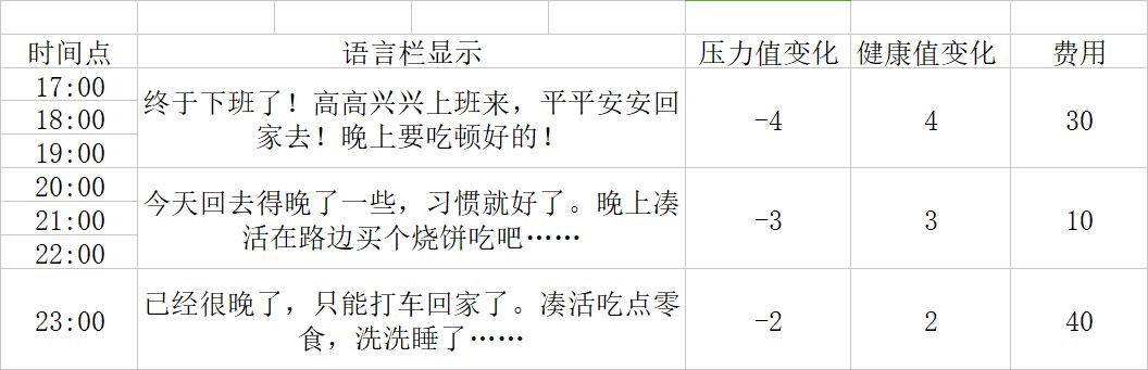 我再分享一份特殊玩法,不工作骂人流。首先前期把孟郁的技能刷到3~4级。送礼也好闲聊也好,总之前期的首要任务是刷她的技能,其次是攒攒信任值留着以后掉。技能等级够了,就可以不工作了。白天骂三次人然后随便干什么都行,等到五点就可以回家,王总不让你回去你就稍微工作一下再回去。因为就算任务堆积,也不会掉健康。每天健康计算方式是先扣压力过大掉的健康,再涨任务堆积的压力。所以即使任务堆积白天会涨一百压力,骂三次人也可以把压力控制在个位数,晚上不会因为压力大扣健康。这个方法的优点是刷结局快,每天五点回家比每天十点回家要节省不少时间。缺点是因为不工作信任低,工资少,但不乱花钱一般都是够用的。最好每个周末去加个班,攒攒信任,白天摸鱼的时候用来掉。还有不工作能力也会偏低,无法达成一些特定结局的条件。切记不要骂王总太多,容易开除你或者你骂死他。