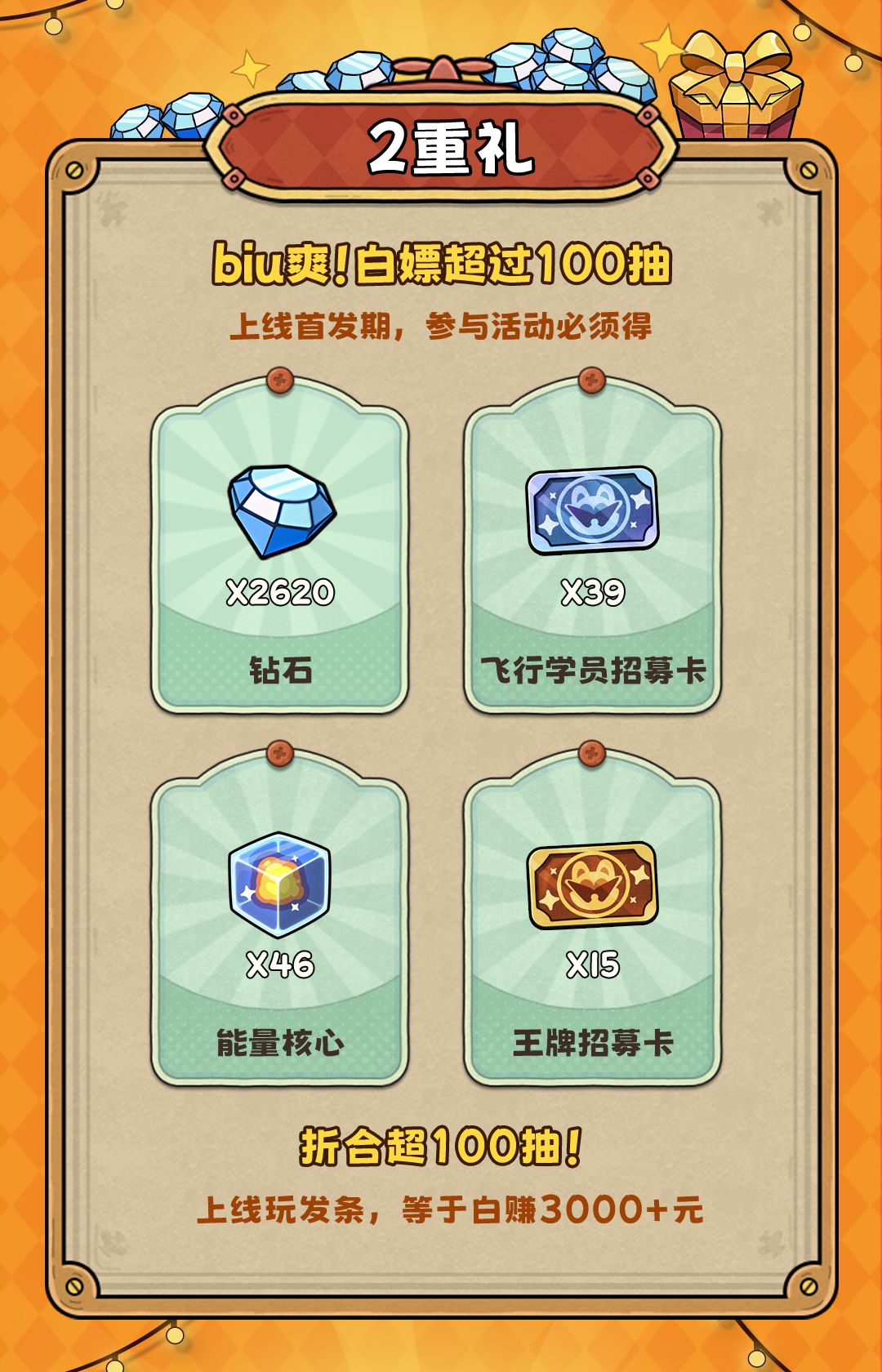 上线即享“白嫖超100抽”福利!包含2620钻石、39张飞行学员招募卡、46个能量核心、15张王牌招募卡,总价值3000+元!全能启航礼包直接塞进背包!