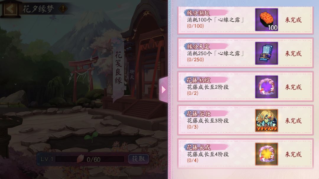 ※「花夕缘梦」:大人可通过花合战、探索副本、御魂副本(除业原火)、觉醒副本、「默契天成」玩法获取「心缘之露」,消耗「心缘之露」浇灌缘结花藤,当花藤成长到一定阶段时,将解锁全新限定动态头像框「花影缘桥·樱风」等活动奖励。