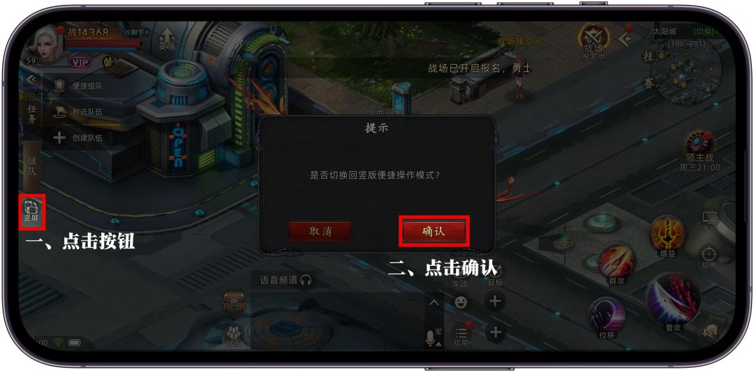 点击屏幕左边竖屏按钮,点击确认,即可进入竖屏便捷操作模式