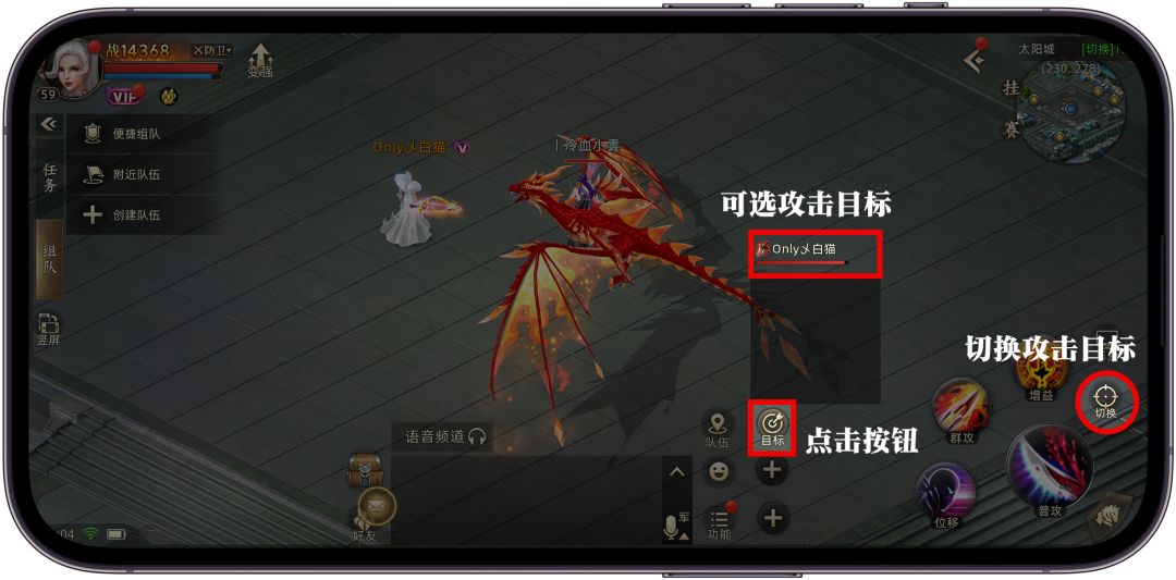 点击敌方或普攻键,即可对指定目标进行攻击,点击技能键,可对目标释放技能;点击技能栏右侧的“切换”键或通过目标功能弹窗可以快速切换攻击目标;