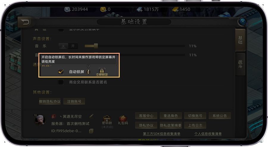 自动锁屏需要手动开启,开启后游戏处于长时间挂机会自动进入屏幕锁定状态,为手机节能省电的同时还能防止误操作,可根据自身需求进行开启或关闭该模式