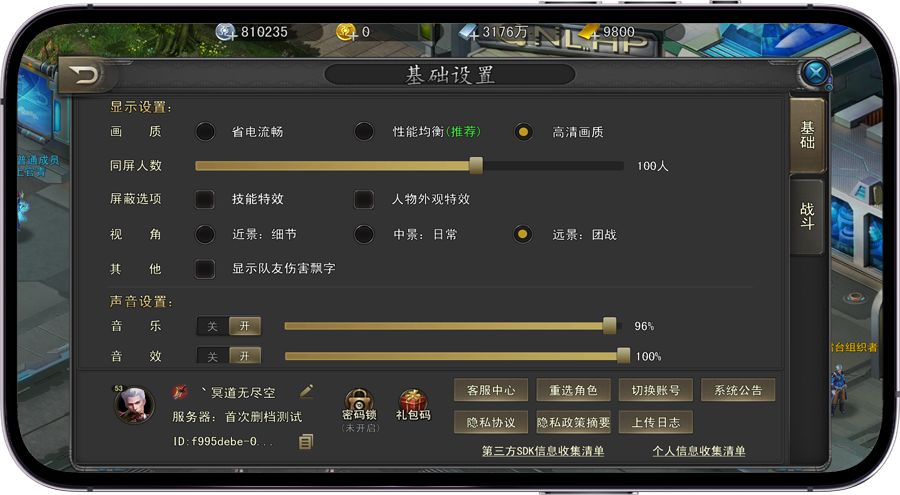 玩家在此页面,可根据自身设备的性能,对画质、同屏人数、特效、视角、音量进行调节,可根据自身喜好进行调整,从而获得更好的游戏体验。