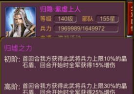 武将提供:如【归隐·紫虚上人】、【老寿星】和【仙师·左慈】等都是可以按照最高兵力上限来提供晶石盾的,可以与阵符提供的晶石盾叠加数值。