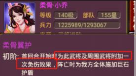 护盾颜色为黄色带盾牌特效的光盾,不带数值,能够免疫一次攻击,若有攻击多次的武将进行攻击,就只能免疫第一次攻击。