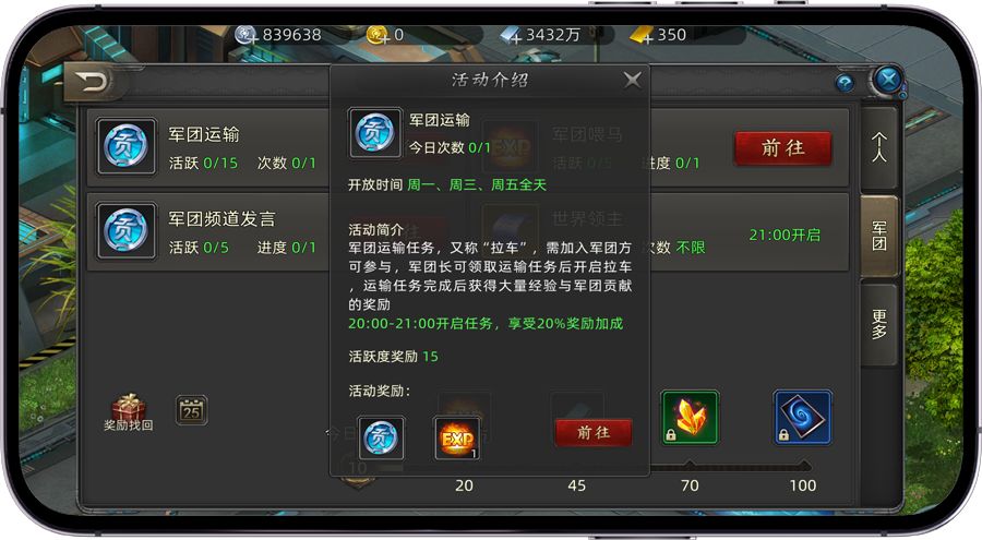 每周一、三、五由团长、副团、指挥开启的活动在20:00-21:00时开启活动有20%额外加成
