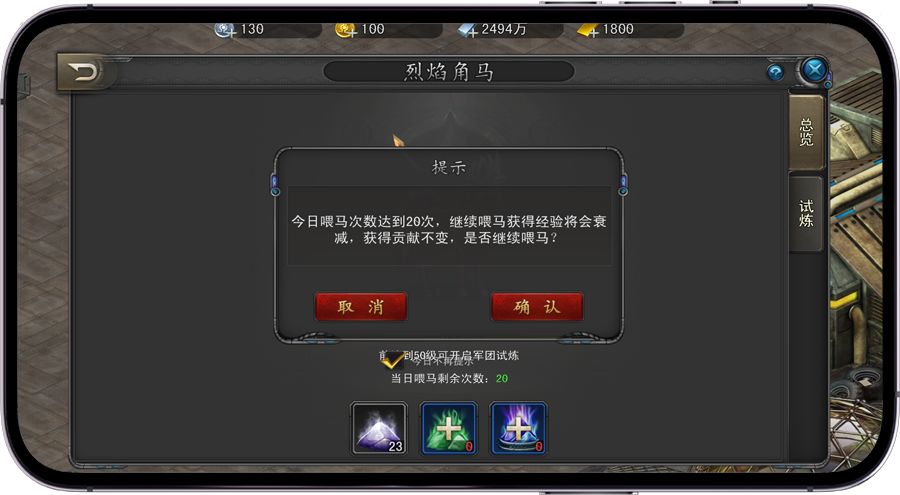 步骤三、玩家每日可进行40次喂马,前20次喂马获取的经验不会衰减,20次后继续喂马,获取经验将会衰减,但获取的军团贡献数量不会衰减。