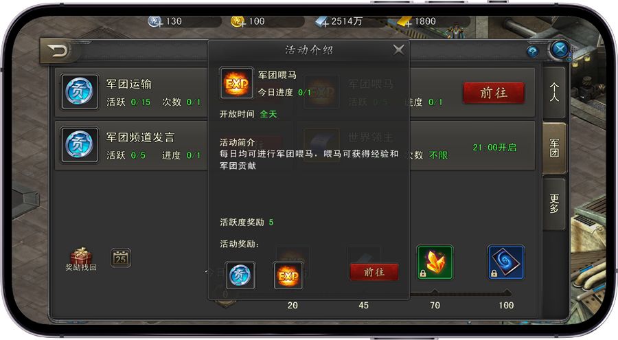 玩家每日可在军团-军团基地-烈焰马中进行喂马玩法,喂马可获得经验和军团贡献度。