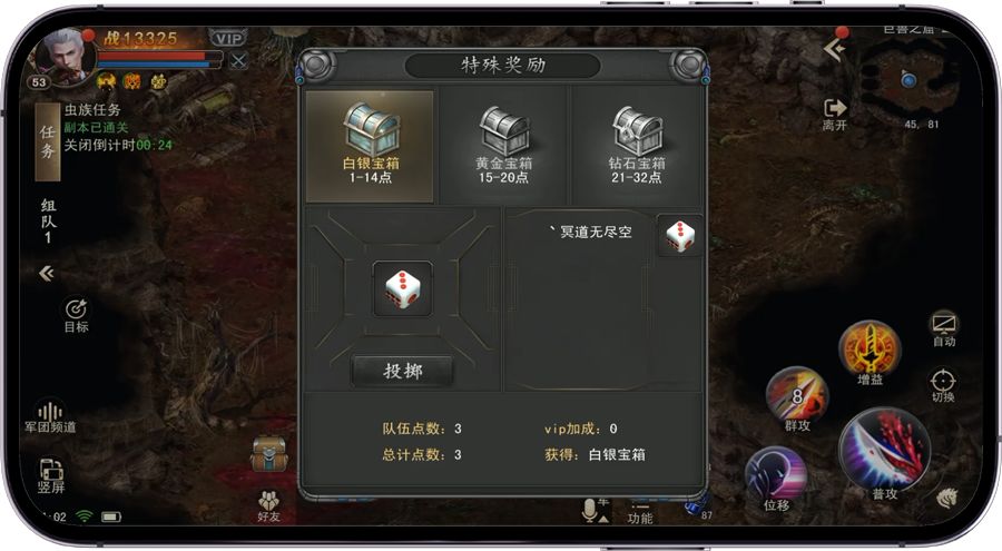 步骤五、 玩家在完成虫族任务后,可获得扔骰子点的机会。根据点数大小决定奖励宝箱和相应奖励。 击杀虫族BOSS后,副本内所有成员弹出扔骰子面板,每个玩家都可以进行一次扔骰子,根据所扔出点数的总数,刷新出相应的宝箱,开启宝箱后开出奖励。