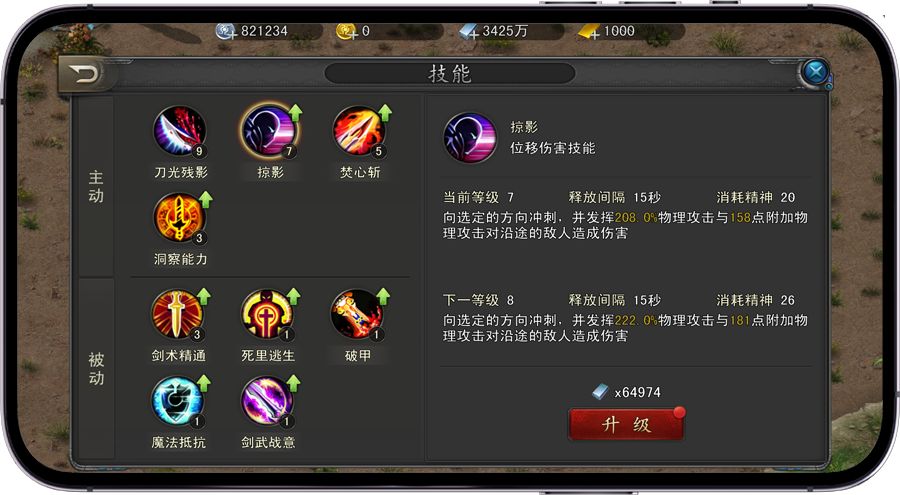 步骤二、玩家可以使用绑银(不消耗角色经验)进行职业技能升级,技能升级后能够直接提升技能伤害与角色战力