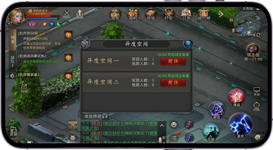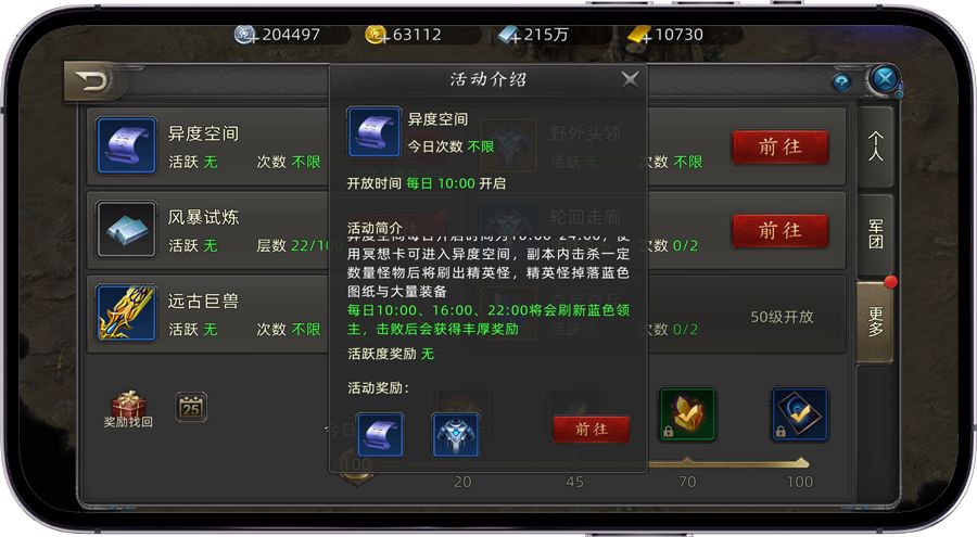 异度空间是让玩家自由战斗,争夺图纸装备资源的副本玩法,副本开启需要携带冥想卡,每张冥想卡可以让一名玩家在异度空间内停留30分钟。