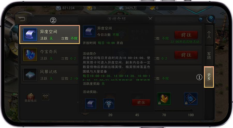 步骤二、点击日常-更多-异度空间自动寻路至NPC处