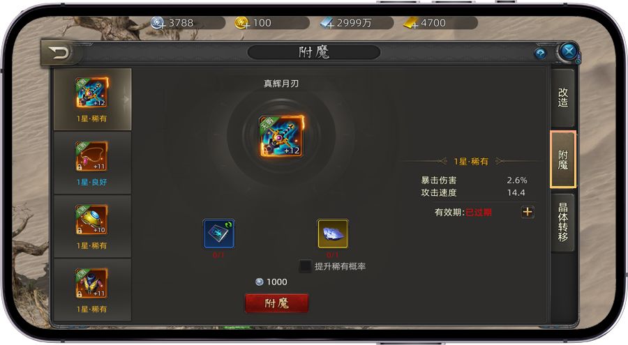步骤三、附魔过期后需要消耗附魔碎片或附魔水晶进行续时,或重新进行附魔。附魔碎片可通过商城或游戏商会进行购买。